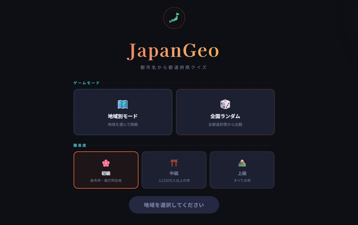 表示された都市名から都道府県を当てる4択クイズです。